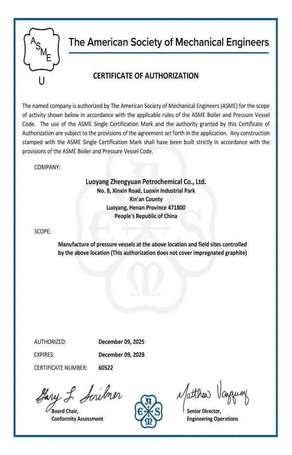 February 2026, Luoyang, China — Luoyang Zhengyuan Petrochemical Co., Ltd. recently announced that the company has successfully obtained the latest certification from the American Society of Mechanical Engineers (ASME). This achievement marks another important milestone in the company’s ongoing commitment to international technical standards and high-end equipment manufacturing.