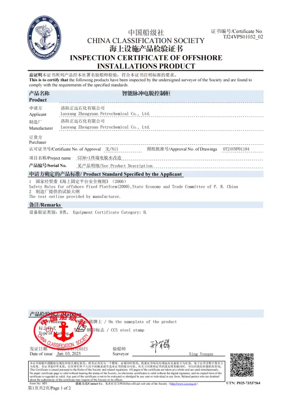 Electrostatic Agglomerator Separator Skid 24R06 Ship Inspection Certificate-1